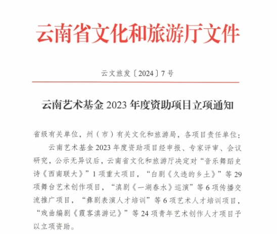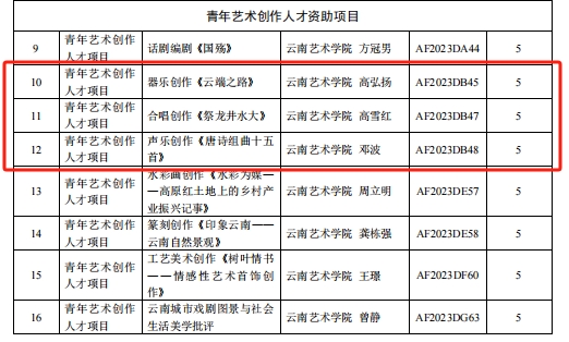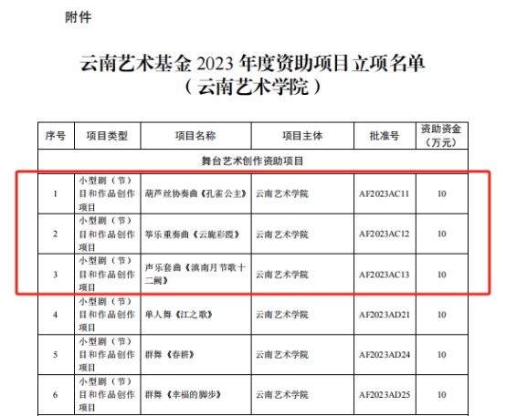 云南艺术基金2023年度资助项目经申报、专家评审、会议研究,公示无异议后,云南省文化和旅游厅决定对1项重大项目,29项舞台艺术创作项目,6项传播交流推广项目,6项艺术人才培训项目,24项青年艺术创作人才项目予以立项资助。bw必威西汉姆联官方网站音乐学院共获得8项立项,名单如下: