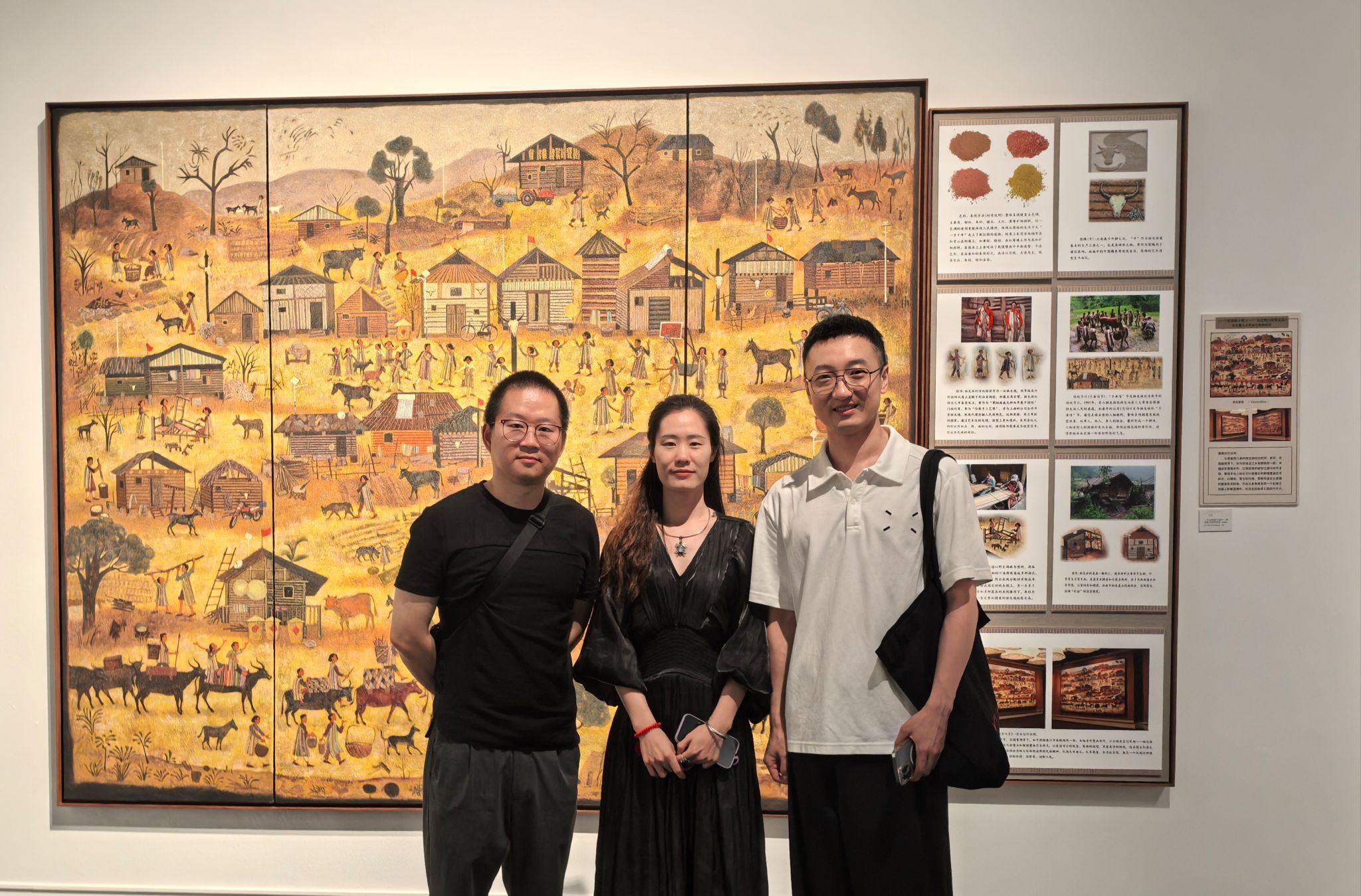 我院美术系教师刘洋、尹雁华带领本科学生饶诚和美术学院研究生白勒发、董福三位同学,共同合作完成岩彩壁画作品《一个民族都不能少 —— 独龙族之脱贫攻坚》入选第十四届全国美术作品展,并于2024年7月12日在河南郑州美术馆展出,获得一致好评。