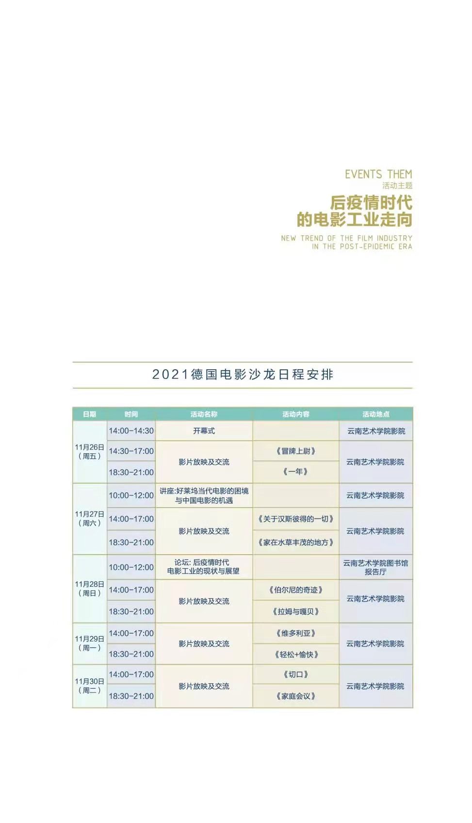活动旨在搭建优秀电影作品学习交流的平台,使云南成为对话世界电影、走向世界市场的重要窗口。在为期5天的时间里,学者们将结合5部优秀的德国电影展开学术探讨;同时,5位中国导演将对其作品进行分享交流。此外还有一批国内外一线电影工作者、研究者和高校相关专业师生共同探讨后疫情时代的电影现状和未来。