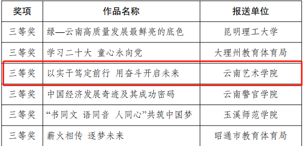 为深入学习宣传贯彻习近平新时代中国特色社会主义思想和党的二十大精神,推动党的创新理论“飞入寻常百姓家”,推进大中小学思想政治教育一体化建设,2023年3-6月,省委教育工委、省教育厅举办了2023年“云岭师生说”理论宣传比赛,bw必威西汉姆联官方网站《以实干笃定前行 用奋斗开启未来》获语言类(学生组)三等奖,《纪年》获文艺类优秀奖。