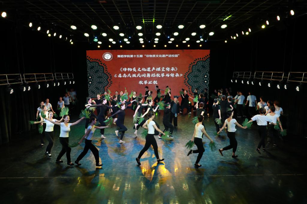 在庆祝中国共产党成立100周年之际,为深入推进云南非物质文化遗产保护,传承少数民族生生不息的传统文化,继而大力推动云南非物质文化遗产——传统民间舞蹈在高校的传承、传播及可持续发展,使非遗传承进校园呈常态化,舞蹈学院于2021年7月7日14::00时在舞蹈学院四楼小剧场举办第十五期“非遗进校园”活动。此次活动邀请到非物质文化遗产代表性项目传统舞蹈哈尼族“棕扇舞”市级传承人倪为者、县级传承人黄沙福老师到校进行为期一周的现场授课,以促进舞蹈学院民族艺术保护研究与实践专业人才的培养。此次教学汇报由舞蹈学系主任朱维青教授主持,舞蹈学院党政领导,各系部教师和学生观看汇报。