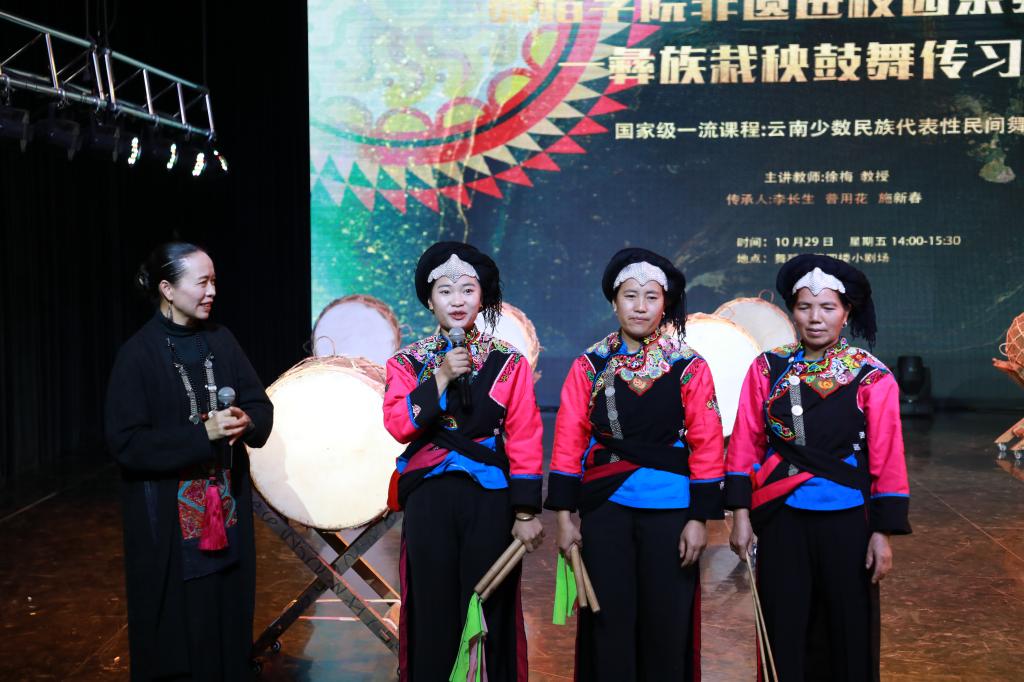 此次非遗传习活动邀请到了红河州绿春县牛孔乡彝族“栽秧鼓舞”省级传承人李长生,州级传承人普用花、施新春及其孙女李丽到校进行为期一周的传习教学活动,以舞蹈学院2018级表演专业女班为主要授课对象,舞蹈学院部分研究生也参与到本次教学实践活动中。