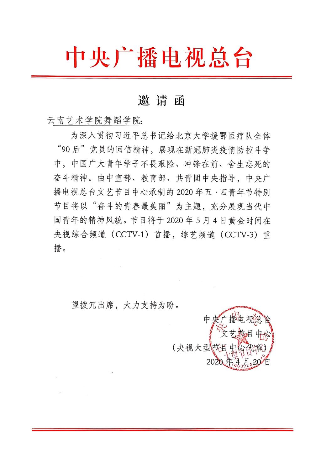 此次受邀,我院党政领导高度重视,全院师生备受鼓舞,参与完成录制的师生也精心排练、准备,以突出云南绚丽多彩的民族文化,展现我省少数民族青年团结、向上、奋发的良好精神风貌,并希望借此表达云南广大青年学子对伟大祖国的美好祝愿。