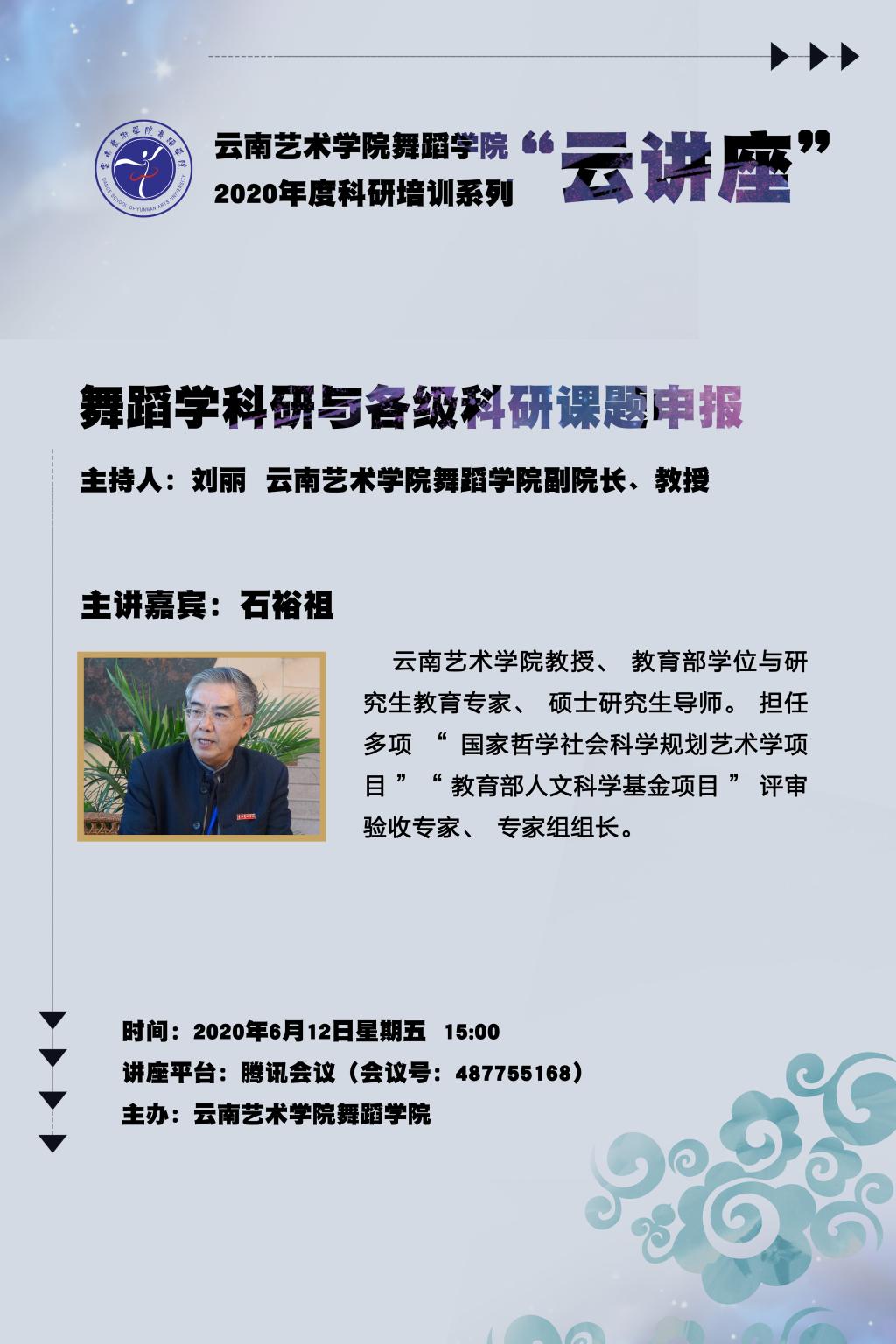 此次科研培训邀请了云南省民族艺术研究院原院长、《民族艺术研究》期刊主编马云华老师和bw必威西汉姆联官方网站教授、硕士生导师、舞蹈学者石裕祖教授,分别做了题为《艺术学课题(项目)申报要点》和《舞蹈学科研与各级科研课题申报》的专题讲座,并就师生在线提问进行答疑解惑。两位专家主要针对国家社科基金艺术学、云南省哲社艺术学规划课题的基本概况,艺术类课题(项目)申报的要点,以及课题的选题原则、申报书的填写规范、舞蹈学科的申报范围和思路等相关知识做了详细解读。刘丽副院长在总结中强调了教师课题申报特别要注意的重点问题,包括对课题指南的再三研读、对当下文化艺术发展前沿问题的宏观了解、如何将教学与创作的实践经验转化为理论研究思维等,并希望教师能够在长期的教学与创作实践积累中,逐渐加强研究意识,用科研成果反哺实践。