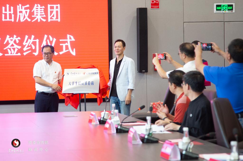 随后,黄雁玲书记、郭浩院长、李从熙副书记与李维书记、江庆波总经理、杨志强副总经理一同为“出版中心”“大学生创新创业教育实践基地”“大学生阅读体验店”三个校企合作项目揭牌。