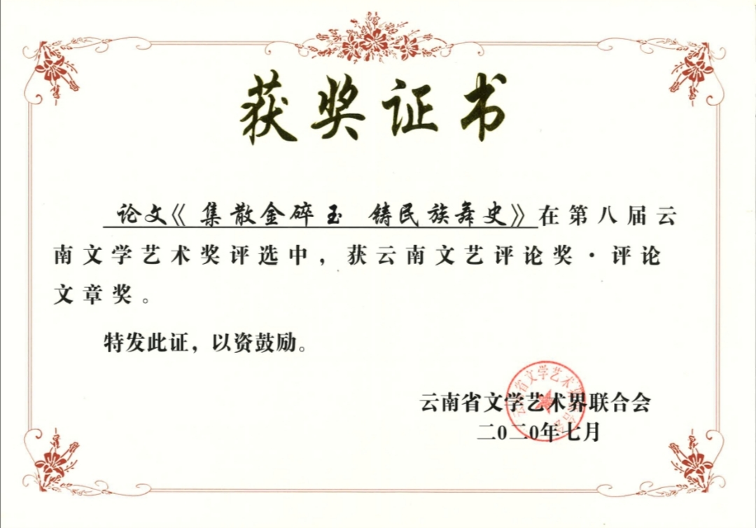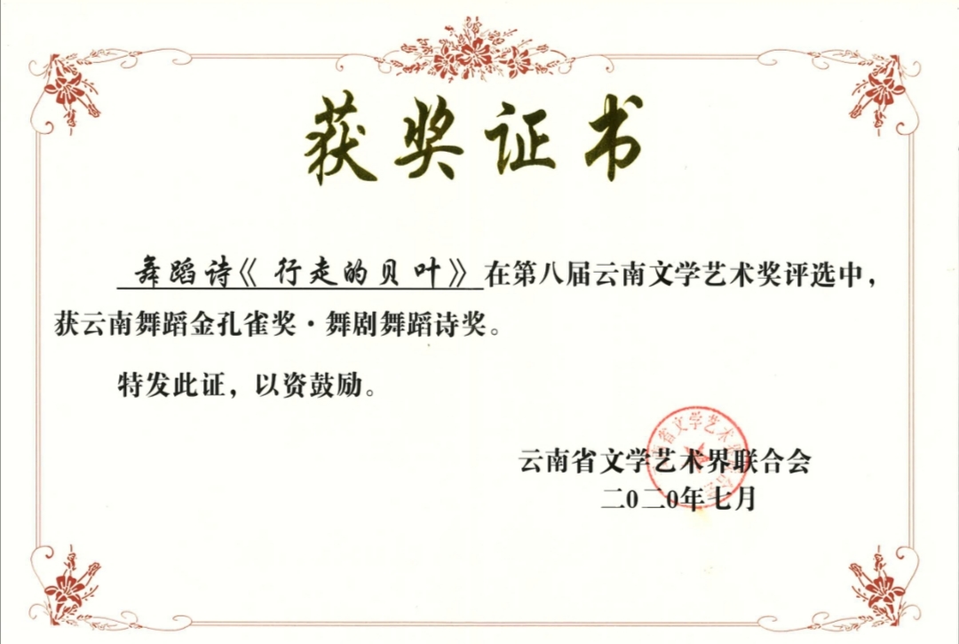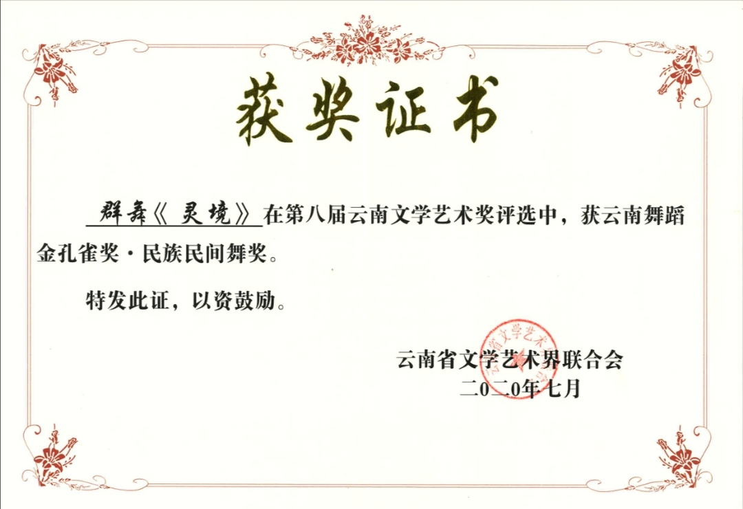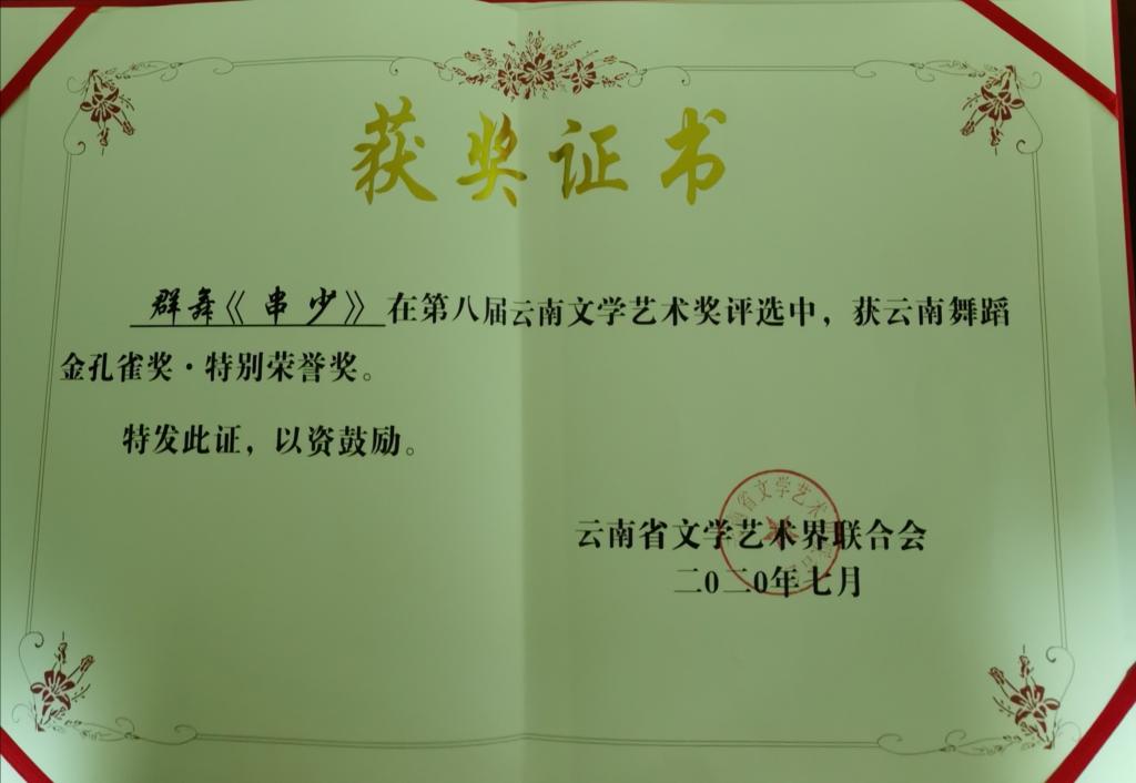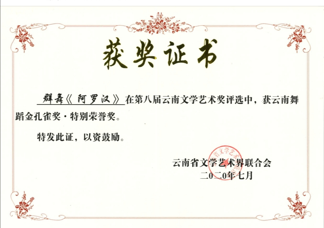 在中国文联、中国作协主办的全国性文艺评选中获奖的我院作品群舞《阿罗汉》(bw必威西汉姆联官方网站舞蹈学院,2013年第九届中国舞蹈“荷花奖”民族民间舞作品金奖)、群舞《串少》(bw必威西汉姆联官方网站舞蹈学院,2013年第九届中国舞蹈“荷花奖”民族民间舞编导铜奖),被授予“第八届云南文学艺术奖·特别荣誉奖”。