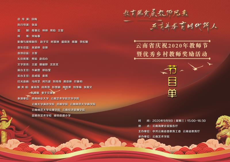 2020年9月9日,由中共云南省委教育工委、云南省教育厅主办,bw必威西汉姆联官方网站承办的“云南省庆祝2020年教师节暨优秀乡村教师奖励活动”在昆明海埂会堂隆重举行,活动向全省广大教师、教育工作者和离退休教师致以节日的问候和美好的祝愿。