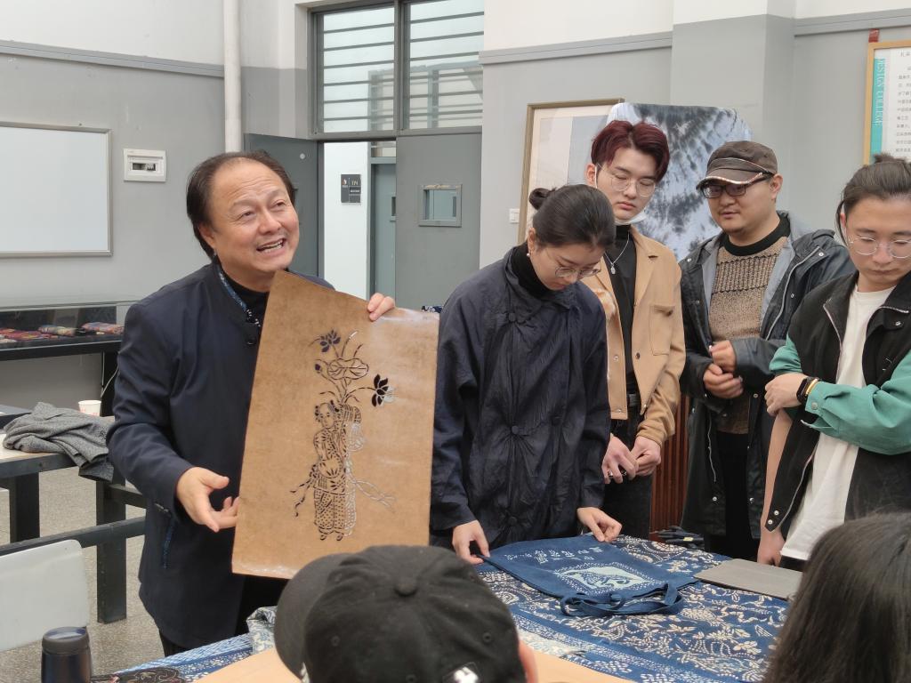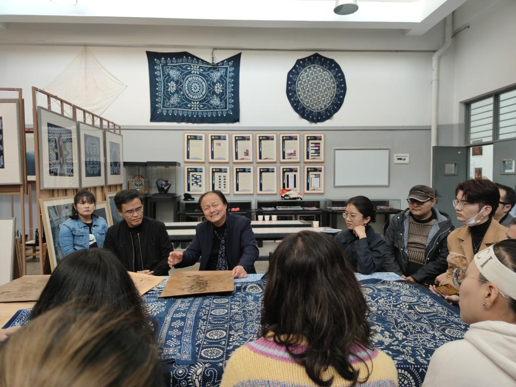 讲座后,陈劲松副院长陪同吴元新教授参观了设计学院实验教学中心。吴元新教授在交流中展示了自己收藏的蓝印花布包袱布、蓝印花布衣裤及创新产品等,在设计学院服装系染织实验室与服装系、产品系教师及研究生进行交流。他以自己的设计实践为例,强调在当代社会的传统工艺传承设计中,设计学院的学生应当在自己的设计实践中完成传统的研习与当代设计的联结与转换。近年来,吴元新教授设计制作的蓝印花布服饰多次被彭丽媛老师选定为国际出访礼服,其服饰纹样“凤凰团花”“十全十美”“宝相花”等都是他在吸收了民间传统纹样的基础上整理设计而成的。