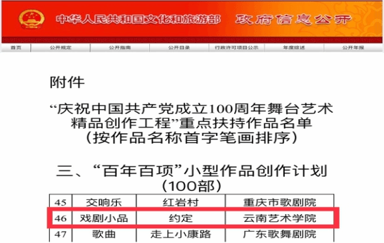 近日,国家文化和旅游部公布了“庆祝中国共产党成立100周年舞台艺术精品创作工程”重点扶持作品名单。名单包含100部“百年百部”创作计划重点扶持作品、100部“百年百部”传统精品复排计划重点扶持作品、100个“百年百项”小型作品创作计划重点扶持作品。bw必威西汉姆联官方网站戏剧学院师生原创抗疫题材小品《约定》入选“百年百项”小型作品创作计划重点扶持作品名单。