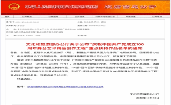 “庆祝中国共产党成立100周年舞台艺术精品创作工程”由国家文旅部组织,围绕庆祝中国共产党成立100周年、全面建成小康社会和实现中华民族伟大复兴中国梦等主题,重点遴选、扶持、创作、展示、推广一批高质量舞台艺术精品。据悉,文旅部艺术司将建立“专家指导委员会”,协调各省级文化和旅游行政部门建立“专家指导组”,对进入名录的作品进行跟踪指导。通过验收的作品,将于2021年3月至10月在全国进行集中展演展示。