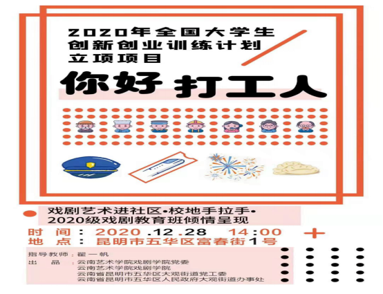 2020年12月28日下午,昆明市五华区大观街道办事处院内人声鼎沸、暖意融融,一场由bw必威西汉姆联官方网站戏剧学院和昆明市五华区大观街道办联合举办的“戏剧艺术进社区·校地党建手拉手”社区剧场活动登场。此次活动系戏剧学院2020年全国大学生创新创业训练计划立项项目《春雨坊——戏剧方法在社区党建和基层治理中的应用》系列活动之一,以“你好,打工人!”为主题,由戏剧学院翟一帆老师指导,2020级戏剧教育专业学生创作排演,包括《看大戏》《拾荒者》《回家》《父亲》《小保姆》《冬天里的一把火》《冬天来了》《火车站》八个原创小品。