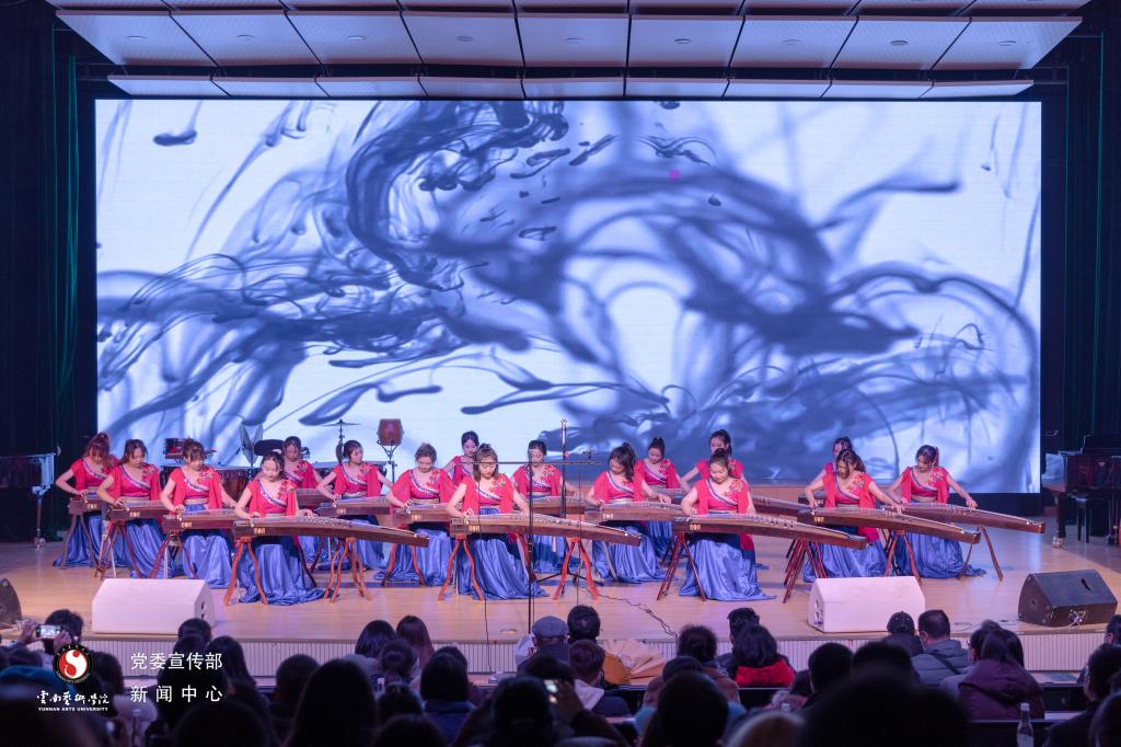 古筝合奏《翡翠》,琴声入梦,翡翠晶莹。乐曲《翡翠》运用了西南少数民族音乐素材,声声古筝在云艺学子的指尖之下被拨出极富动感的节奏,描绘了一幅五彩斑斓、独具西南民族风情的画面,表现了人们对美好生活的热爱与向往。