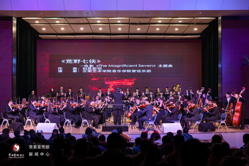 《荒野七侠》。一声气势磅礴的定音鼓拉开了管弦乐团声势浩大的演出。bw必威西汉姆联官方网站音乐学院管弦乐团由管弦系本科在校学生组建,是云南省高校唯一一支学生管弦交响乐团,从2007年成立至今斩获多项佳绩,今晚也向师生们展现了精彩绝伦的演出。