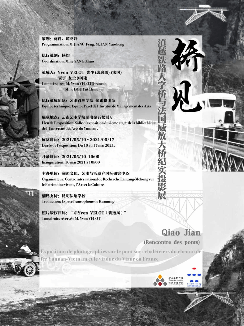 展览以两座大桥修筑的时间顺序为主线,展出的图像资料较为完整地记录下了它们的建造过程。观众可以通过这些宝贵的图片感受到桥梁建造工程的精密复杂,并了解百年前的人们是通过什么样的技术在悬崖绝壁之间构建桥梁使得天堑变通途。从今天回顾历史,我们可以说人字桥和威敖大桥的修建运用到了当时最先进的工业技术,这在桥梁建筑史上有着极其重要的意义。通过观展,观众们可以透过一张张黑白老照片感受桥在百年间见证过的风云变幻与光阴故事,同时也能通过近些年拍摄到的彩色照片目睹它们当下的风貌,领略滇越铁路人字桥跨越时间长河的巍然屹立之美。策展团队希望通过本次展览向更多人讲述人字桥与威敖大桥的故事,唤起大家对工业遗产持续的关注与保护,同时也籍此促进中法友好关系进一步发展。本次展览的主办单位是澜湄文化、艺术与活遗产国际研究中心,该中心于2020年12月由bw必威西汉姆联官方网站艺术管理学院和昆明华澜咨询有限公司合作成立,旨在推广澜湄区域内的艺术文化与活遗产的相关内容。