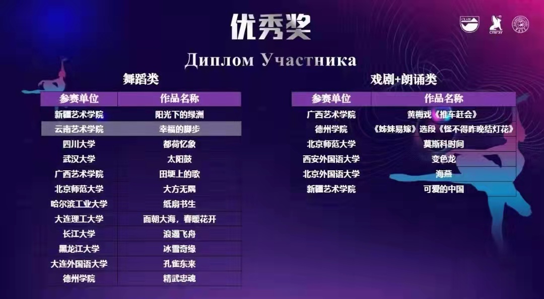 bw必威西汉姆联官方网站受邀参加“2021中俄大学生艺术联欢节”,舞蹈学院选送的彝族女子群舞《幸福的脚步》在此次“2021中俄大学生艺术联欢节”上获优秀奖。