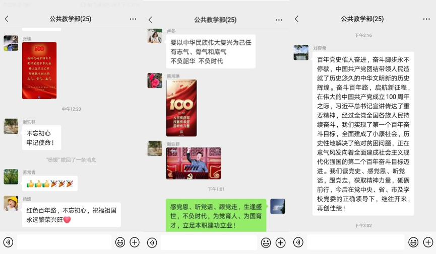 公共教学部的全体干部教师,在观看了今天上午党中央庆祝中国共产党成立100周年大会直播实况,聆听了习近平总书记发表的重要讲话后,心情澎湃,感慨万千,在座谈会交流后,大家继续通过部门微信群热议建党百年,交流感想心声。