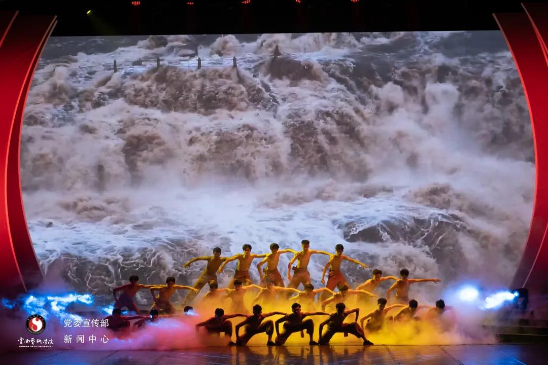在山河破碎、民族危亡之际,黄河开始咆哮,响遏云霄,谱写了一首滂然沛然的战歌。而今重温经典,舞蹈演员们生动的表演与屏幕的黄河完美结合,合唱团的同学们用嘹亮高亢的歌声,整齐划一的合唱出激扬无悔的青春,用激情与热血照亮前进的方向。