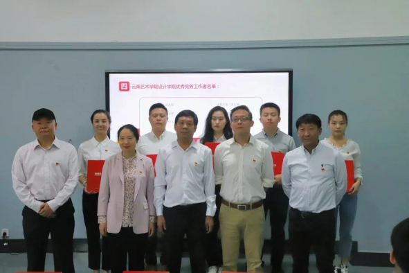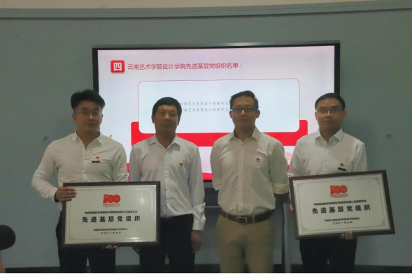 党委班子成员余光荣、王进、杨凌辉、胡云斌、周映河等同志分别为获设计学院党委表彰的优秀共产党员、优秀党务工作者和先进基层党组织负责人颁发了证书、奖牌。