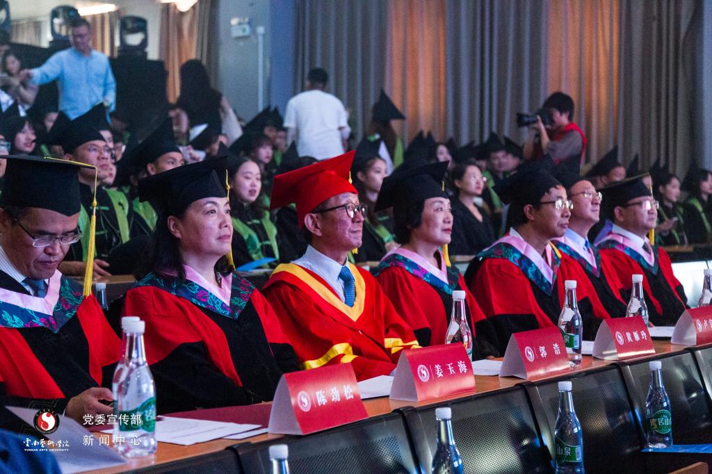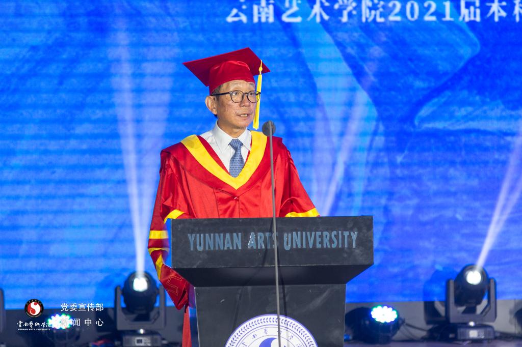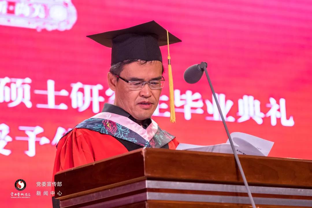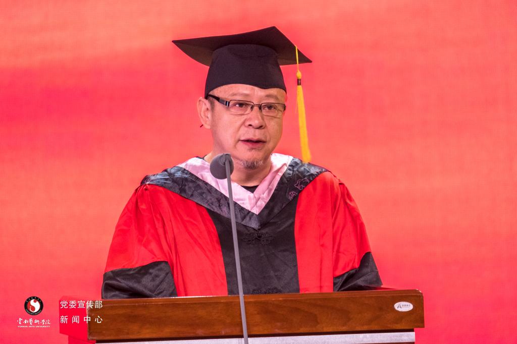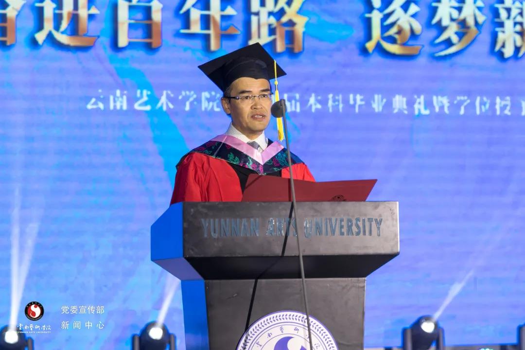 校党委副书记、院长、学校学位评定委员会主席郭浩致辞。致辞中提到以下两点:第一,一定要懂得科学视野与社会实践的平衡;第二,一定要把握坚守理想与抵达成功的秘诀;最后他希望云艺毕业学子能够成为一个个有胸怀、有担当、有修养、有情怀的新时代青年,希望他们能够展翅高飞、鹏程万里,早日取得更大的成绩,早日成为国家的栋梁之才。