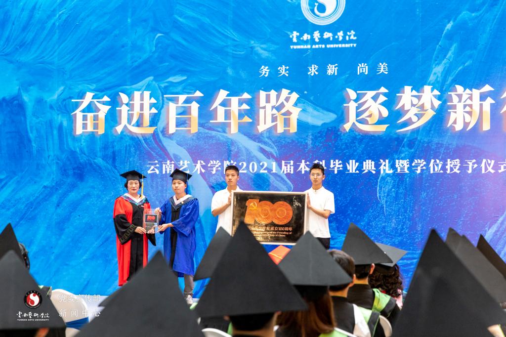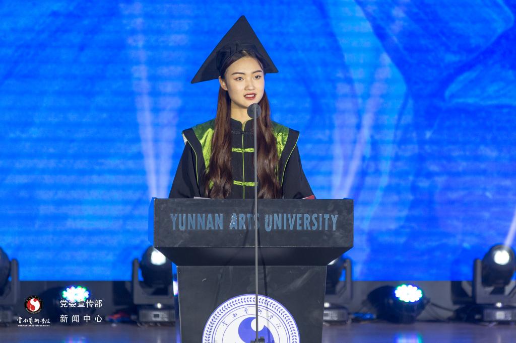 2021届本科毕业生代表张露月同学在发言中表达了对母校深深的眷恋和不舍。回望过去四年,良师用高尚的教师理想和严谨的教学态度,指导者每一位云艺学子成长。益友身上的闪光点深深地激励着,感染着自己。最后她表示作为这个时代的新青年,要坚定理想信念。要明确目标,坚定信念。常怀一颗好学之心和勇敢之心。希望每一位毕业生,最终都能够在自己热爱、坚持的领域发光发热。