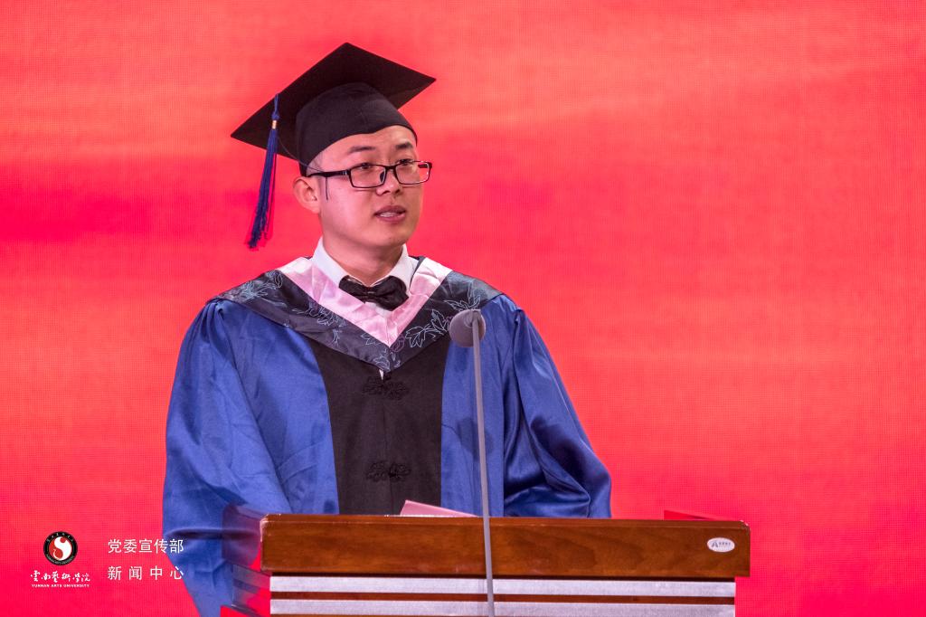 2021届硕士毕业生林康同学代表全体毕业生向母校和老师们表示衷心的感谢。“回顾自己三年的学习生涯,当初入校时的澎湃激情仿佛仍在心中荡漾。”他表示在未来将永远以“务实、求新、尚美”勉励自己,开创属于自己的新天地,做时代奋发有为的云艺学子,用母校赋予的知识和智慧描绘出壮美的人生画卷。