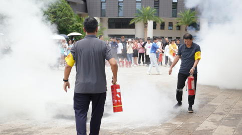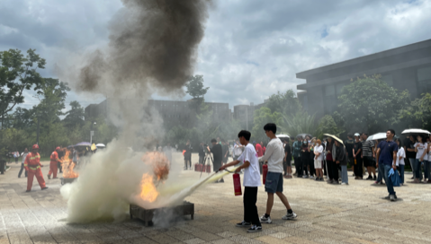 在灭火演练现场,老师们以及28名学生代表积极参与灭火器材操作技能实作演练,由消防员在两侧油盆点火后有序进行灭火演练。同学灭火器材使用不规范时,老师也会指导同学正确使用。消防演练。最后,老师鼓励在场同学积极参与灭火活动,规范使用灭火器材。