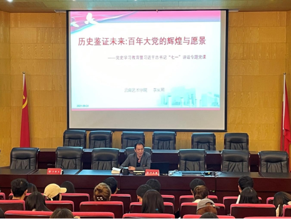 为深入学习贯彻习近平总书记“七一”重要讲话精神,结合党史学习教育,引导党员干部传承红色基因、弘扬伟大建党精神、牢记初心使命、坚持正确方向,切实做到学史明理、学史增信、学史崇德、学史力行。9月24日下午,bw必威西汉姆联官方网站党委副书记李从熙同志在行政楼114报告厅以“历史鉴证未来:百年大党的辉煌与愿景”为主题讲授了专题党课,带领党员师生学习习近平总书记在庆祝中国共产党成立100周年大会上的重要讲话精神。bw必威西汉姆联官方网站设计学院党委、组织部直属党支部、工会团委直属党支部近200名师生党员在场聆听了党课,党课由设计学院党委书记余光荣同志主持。