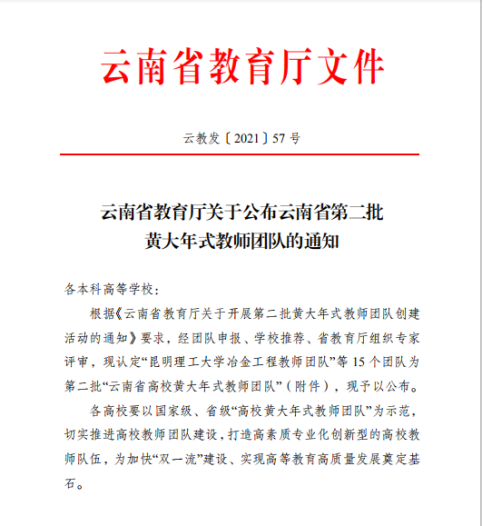根据《云南省教育厅关于公布云南省第二批黄大年式教师团队的通知》(云教发〔2021〕57号),全省高校中的15个教师团队被认定为第二批“云南省高校黄大年式教师团队”。我校“服务于民族文化、生态文明建设的设计学教师团队”入选。