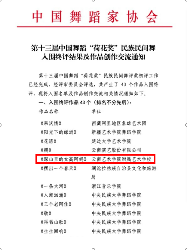 9月3日,第十三届中国舞蹈“荷花奖”民族民间舞评奖初评工作落下帷幕,经评审委员会评选,全国共产生43个作品入围终评。其中,由我校创作的现实题材女子群舞《深山里的女高阿妈》在全国各省、市、自治区、直辖市推送的327作品中脱颖而出入围终评。