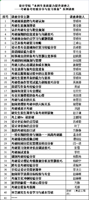升学率提升作为本科教学质量的重要内容,也作为学院教学工作的重点方向受到重视。经分管本科教学杨凌辉副院长、分管研究生教学科研万凡副院长与分管学生工作王进副书记提议,经学院研究,由设计学院教学管理科协同学生管理科面向学院有意向了解考研和备考的本科生持续开展“本科生素质能力提升讲座之考研备考经验分享与复习准备”专场讲座。