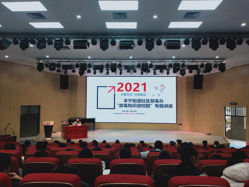 为提高青少年对毒品危害的认识,增强毒品预防和抵制能力,进一步增强法治观念,预防和减少未成年人违法犯罪,为广大师生营造一个安全健康的育人环境,2021年11月10日12:30,我校联合丰宁街道司法所、戒毒办、派出所三个部门,在110艺术实训楼开展禁毒防艾和法治安全讲座。学保科科长杜永正、校卫队员、宿管员、2021级新生班主任、全体新生及部分教师参加讲座,讲座由学保科方艺璇老师主持。