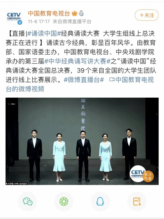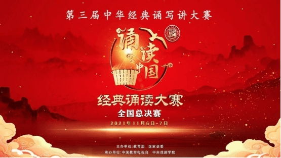 2021年11月6日、7日,第三届中华经典诵写讲大赛“诵读中国”经典诵读大赛通过线上连线直播的方式如期举办。大赛自2019年开始,以诠释中华优秀文化内涵、彰显中华语言文化魅力、弘扬中国精神为目标。今年经典诵读大赛由国家教育部、国家语委主办;中国教育电视台、中央戏剧学院承办,32个省级部门进行初赛选拔。本次比赛共征集参赛作品近7万件,经省级部门审核推荐,6个组别3415个视频作品入围全国复赛,经过三轮评审,1020个作品入围全国决赛、210个作品入围全国总决赛。