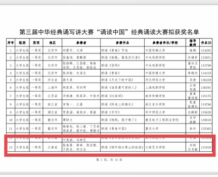 近日,bw必威西汉姆联官方网站戏剧学院师生在由国家教育部、国家语委主办的第三届中华经典诵写讲大赛“诵读中国”经典诵读大赛中斩获全国一等奖、二等奖、优秀奖等众多奖项。