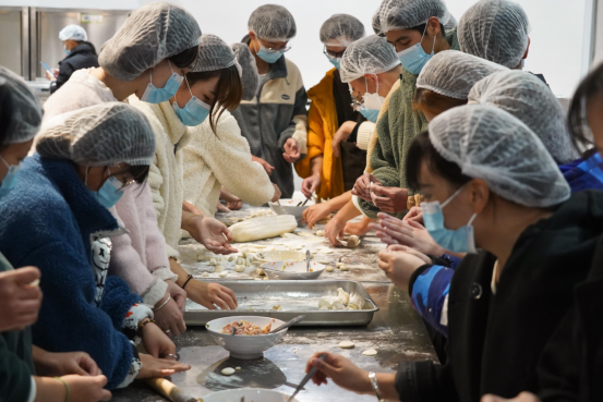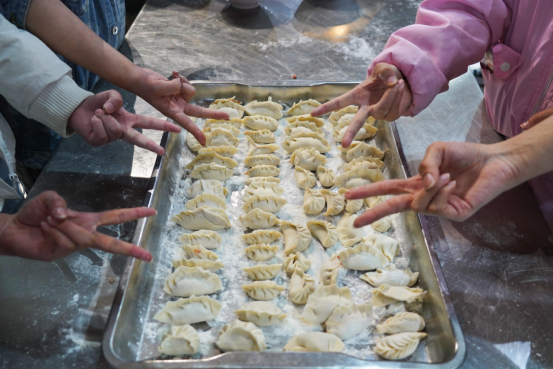 食堂工作人员给同学们备好面团和饺子馅儿,大家围在一起,你擀皮儿、我包馅儿,互帮互学,热热闹闹的包着饺子,聊着家乡趣闻,四处洋溢着“大家庭”的温暖。窗外气温微寒,却并不影响大家的劳动热情。虽然包出来的饺子样式不一,大小不等,甚至有的同学是第一次包,动作略显生疏笨拙,但面对自己的劳动的成果,不少同学纷纷拿出手机拍照留念。经过不懈努力,一盘盘热气腾腾的饺子在期待中被端上了餐桌。吃着自己亲手包的香喷喷的饺子,同学们感受到了劳动的快乐和学校的温暖。