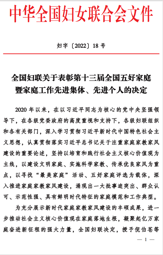 在中华全国妇女联合会组织的第十三届全国五好家庭暨家庭工作先进集体、先进个人的评选表彰中,音乐学院院长林林教授家庭获评“全国五好家庭”。