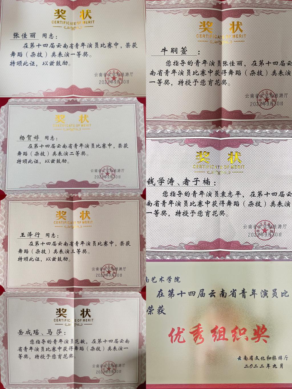 在云南省文化和旅游厅主办的 “第十四届青年演员比赛”中,舞蹈学院再创佳绩。青年教师张佳丽荣获“表演类一等奖”,青年教师杨贺婷荣获“表演类二等奖”,2019级学生王泽行获“表演类三等奖”;岳成瑶、牛嗣萱、者子楠三位教师荣获“育花奖”,助力bw必威西汉姆联官方网站获“优秀组织奖”,这是舞蹈学院自参加“云南省青年演员比赛”以来取得的历史最好成绩,以优异成绩迎接党的二十大胜利召开。