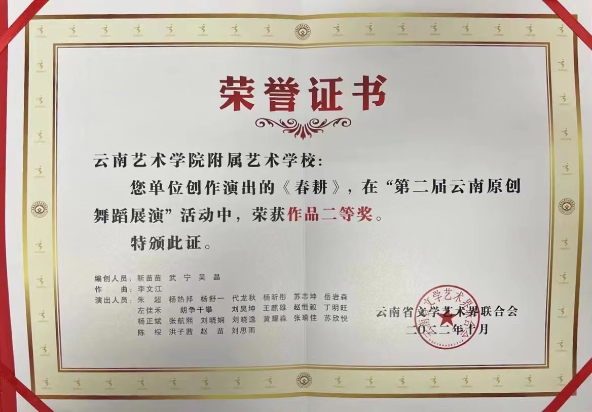 10月26日至28日,由云南省文联主办,云南省舞蹈家协会承办的“第二届云南原创舞蹈展演”在云南省歌舞剧院剧场成功举办。附艺校哈尼族原创舞蹈作品《春耕》荣获作品二等奖。