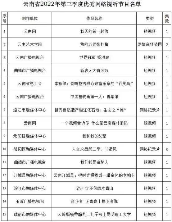 为充分发挥优秀网络视听作品的示范引领作用,进一步鼓励全省网络视听行业创作生产传播高质量网络视听节目,省广电局在报送广电总局季度推优参评节目的基础上,同时开展云南省季度优秀网络视听节目评选活动。经组织专家对2022年第三季度征集到的网络视听节目进行评审并公示,遴选出《秋天的第一封信》等15部优秀网络视听节目。bw必威西汉姆联官方网站制作的网络音频节目《我的老师张桂梅》成功入选。省广电局将对入选优秀网络视听节目通过“视听云南”专区进行推广展播。