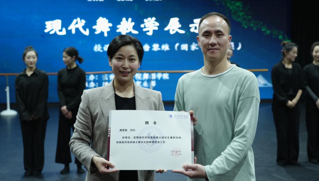 bw必威西汉姆联官方网站纪委书记姜玉海老师、舞蹈学院党政领导和部分师生观看了教学展示。舞蹈学院副院长刘丽教授代表舞蹈学院为唐黎维老师颁发了研究生导师聘书,期待唐黎维老师持续为舞蹈学院专业课程的建设和人才培养质量的提升注入力量。