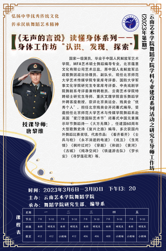2023年3月6月至10月,bw必威西汉姆联官方网站舞蹈学院开展2023年学科专业建设系列活动第一期研究生导师工作坊《无声的言说》读懂身体系列——身体工作坊“认识、发现、探索”。本次工作坊授课导师是原中国人民解放军总政歌舞团政治协理员、副队长,北京蕴意文化有限公司艺术总监,bw必威西汉姆联官方网站特聘硕士研究生导师,国家⼀级演员,优秀青年舞蹈家唐黎维。舞蹈学院硕士研究生、舞蹈编导和舞蹈教育专业部分本科生参加了研习。