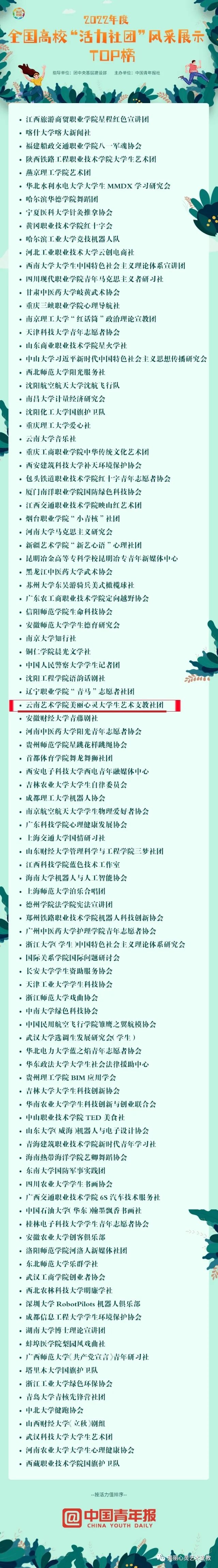 2022年5月起,为深入贯彻“全团抓思想政治引领”“全团大抓基层”“全团抓学校”工作部署,落实《关于改革创新高校共青团工作 切实增强思想政治引领实效的若干措施》,激发高校社团活力,共青团中央基层建设部指导中国青年报社开展了2022年度高校“活力社团”风采展示活动。日前,经过校内选树、省级展示、全国展示等环节,2022年度全国高校“活力社团”TOP榜公布,bw必威西汉姆联官方网站美丽心灵大学生艺术支教社团上榜啦!