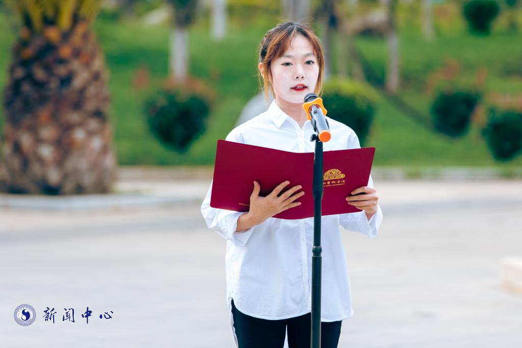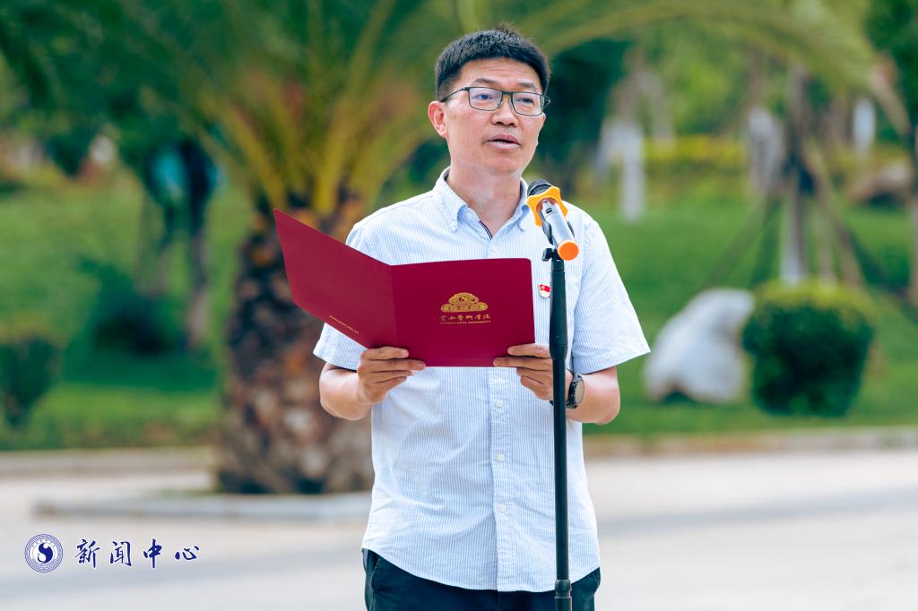 艺术管理学院党总支书记谭尧升代表干部、教师作国旗下演讲。他表示,实现中华民族伟大复兴的中国梦既是国家的梦、民族的梦,也是包括广大青年在内的每个中国人的梦。唯有将自己的小我主动地与祖国和人民的大我融合在一起,坚定地听党话、跟党走,在国家发展的大潮中树立起了正确的人生方向,这样才可以更好地将自己的生命价值实现出来。实现中华民族伟大复兴的中国梦,需要一代代中国人,尤其需要一代代青年矢志奋斗。广大青年要坚定不移听党话、跟党走,怀抱梦想又脚踏实地,敢想敢为又善作善成,立志做有理想、敢担当、能吃苦、肯奋斗的新时代好青年,让青春在全面建设社会主义现代化国家的火热实践中绽放绚丽之花。