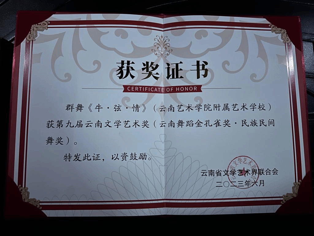 由云南省文联主办、省级各文艺家协会承办的第九届云南文学艺术奖于近期揭晓。我校原创傈僳族群舞《深山里的女高阿妈》及原创藏族群舞《牛·弦·情》喜获第九届云南文学艺术奖,在舞蹈类民族民间舞八个获奖作品中分别排名第二、第四,填补了学校办学以来在该领域奖项中的历史纪录。7月11日晚,原创藏族群舞《牛·弦·情》作为优秀作品代表再次登上颁奖晚会的舞台,获得了现场观众的阵阵掌声。