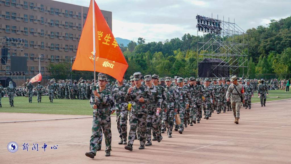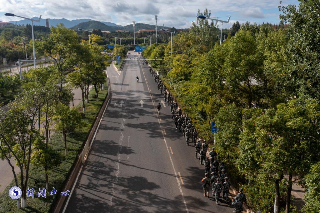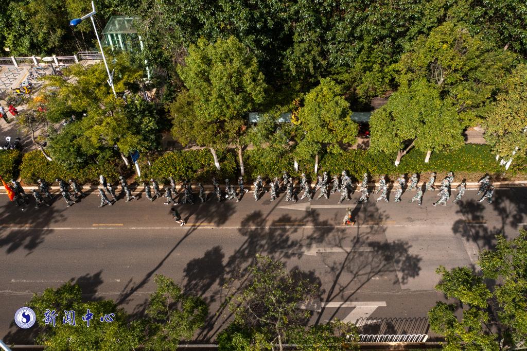 12公里的路线,途径雨花路月华街、彩云南路、云学路、博大路。随行的教官和辅导员老师们寸步不离,与同学们共同进退,确保同学们的安全,队伍后面缓慢行进的大巴是同学们休整的小型基地,但团队的精神与热烈的氛围,让这个可爱的代步工具无人问津。志在心中,路在脚下,同学们迎着朝阳,步伐整齐,呼声嘹亮,士气高昂,前进不止,青涩的脸上洋溢着无畏的笑颜,九月的日光不会比你们灿烂!