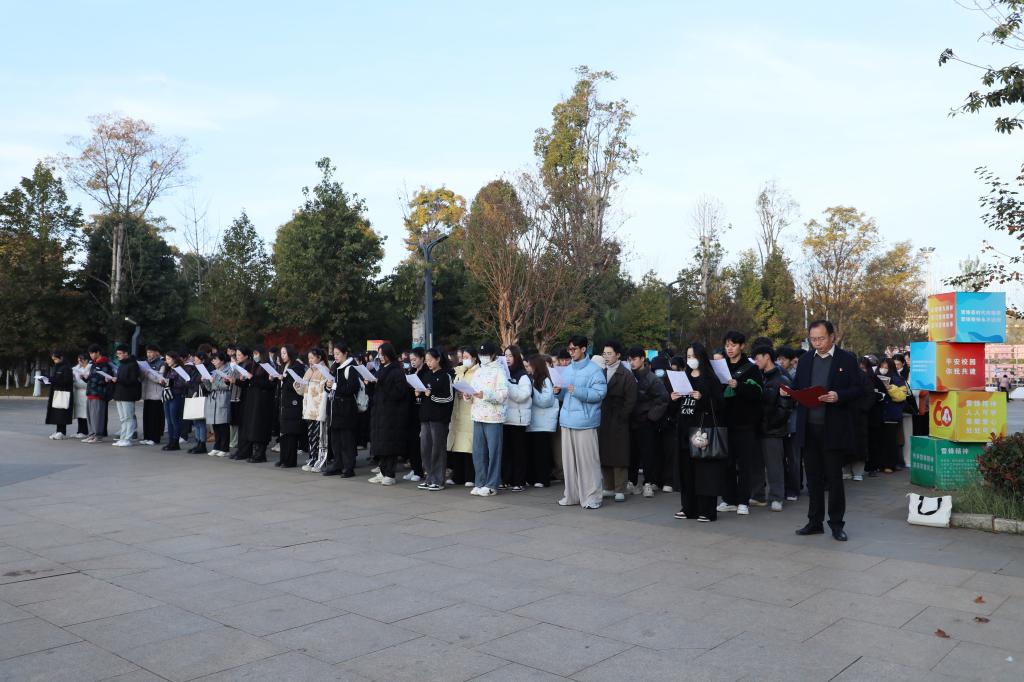 为贯彻落实习近平法治思想和习近平总书记关于宪法法治教育的重要指示精神,按照《bw必威西汉姆联官方网站关于开展“宪法宣传周”暨“学校法治宣传教育月”系列活动的通知》的要求,12月4日上午,舞蹈学院师生在学校国旗广场举行“弘扬宪法精神,厚植爱国情怀,争做时代新人”系列活动。舞蹈学院教师、2023级全体新生、学院部分学生党员和学生干部代表共计300余人参加此次活动。活动由舞蹈学院党总支书记朱超主持。