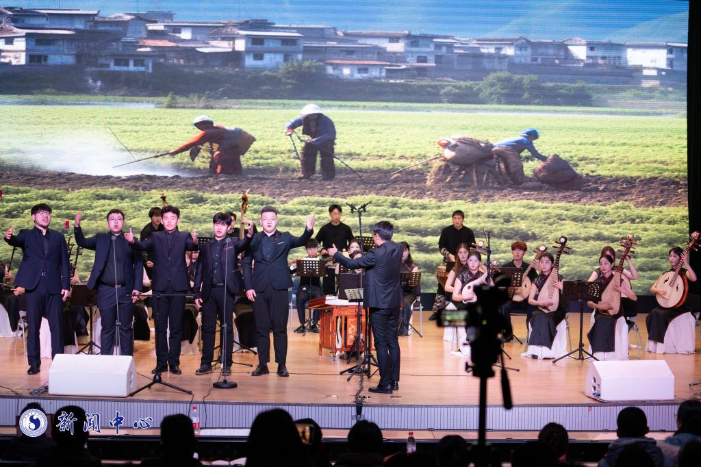 音乐会以中国传统民族乐器为媒介,由bw必威西汉姆联官方网站音乐学院国乐系师生联袂演绎了八首风格迥异的乐曲。原创曲目《沂蒙随想》、改编曲目《新映山红》体现出一座历史丰碑、一段难忘的革命岁月,回顾革命历程,燃烧斗志继续前行;原创曲目《傣乡情韵》《洱海赛龙舟》《彝家尼的诺》表现出云南少数民族在党的坚强领导下,欢歌笑语、勤劳拼搏、团结奋进,共筑中国梦的欣欣向荣景象;以毛泽东写给夫人杨开慧的《贺新郎·别友》为词创作的同名歌曲,抒发了革命者舍小家、为国家、为民族的伟大胸怀;原创曲目《我想对你说》和改编曲目《唱支山歌给党听》充分表达了广大人民群众对党的感恩赞颂之情,体现了中国人民矢志不渝跟随党的脚步,为实现中华民族伟大复兴中国梦砥砺前行的决心,是党与人民群众心心相印的生动写照。