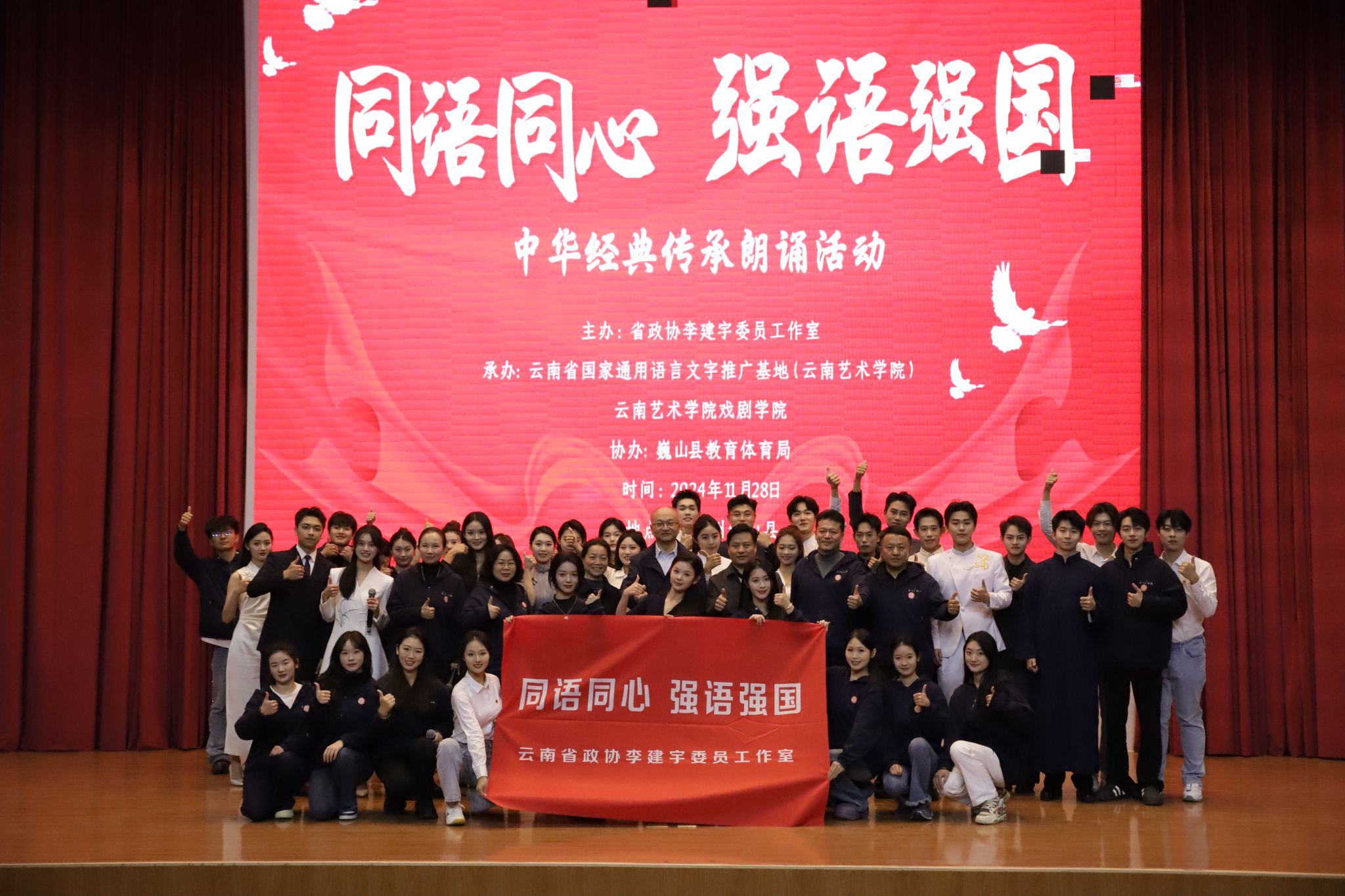 11月28日,bw必威西汉姆联官方网站推普志愿服务队在巍山一中举行了“同语同心 强语强国”中华经典传承主题朗诵展演,800余名师生观看了演出。展演以13个高水平朗诵节目呈现,旨在弘扬中华优秀传统文化,增强广大师生学用国家通用语言文字意识,激发爱党、爱国、爱社会主义的热情,进一步铸牢中华民族共同体意识。11月29日,推普志愿服务队与巍山县教体局举行了“民族地区普通话推广创新路径研讨会”,围绕巍山县推普工作现状、存在问题和下一步常态化扎实做好推普工作进行了深入交流。同时,为巍山二中10个班500余名同学讲授“普通话知识普及和朗诵艺术”公开课。戏剧学院播音系主任王旭东老师为巍山县近200名语文教师开展《同语同心 强语强国—民族地区人群如何说好普通话》专题讲座,现场气氛活跃,反响热烈。