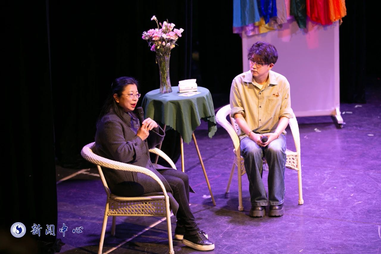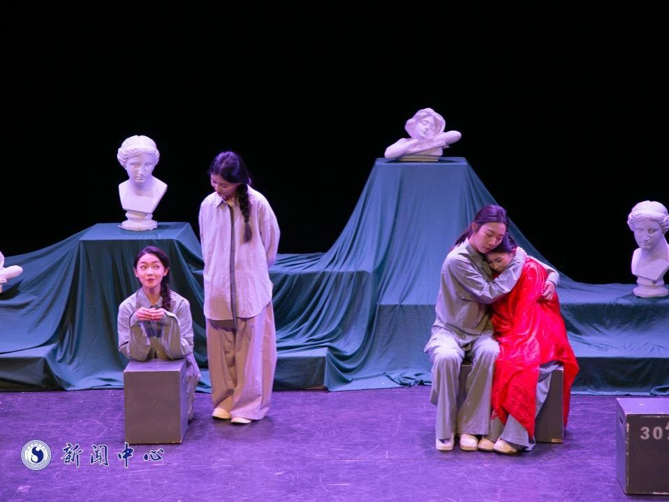 演出采用了应用戏剧一人一故事剧场形式,根据现场女教师的故事分享,由戏剧学院戏剧教育专业的同学运用“情绪回廊”“录影片段”和“自由演绎”等戏剧表演形式进行即兴表演。美术学院同学现场绘制作品、设计学院同学AI辅助设计作品、音乐学院同学现场演唱歌曲,并将所有作品作为礼物送给讲述者。