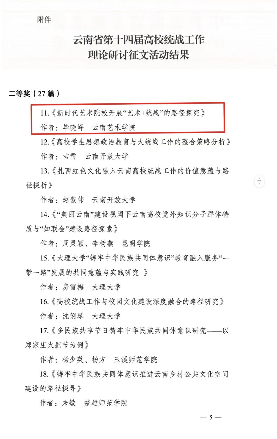一、云南省第十四届高校统战工作理论研讨征文活动结果