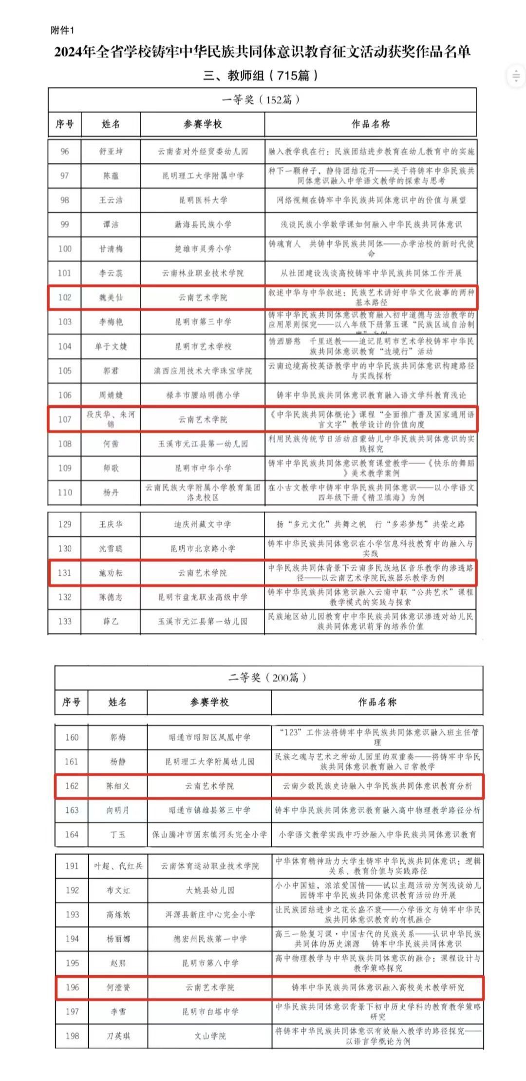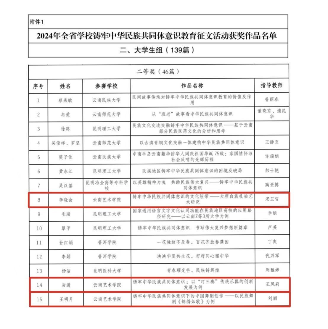 为深入贯彻习近平总书记关于做好新时代党的统一战线工作的重要思想,习近平总书记关于加强和改进民族工作的重要思想和全国民族团结进步表彰大会精神,持续深化铸牢中华民族共同体意识教育,我校师生积极参与省委统战部、省委教育工委举办的2024年“建功新时代 共筑中国梦”为主题的第十四届高校统战理论研讨征文活动和省教育厅、省民族宗教委2024年度云南省学校铸牢中华民族共同体意识教育征文活动。